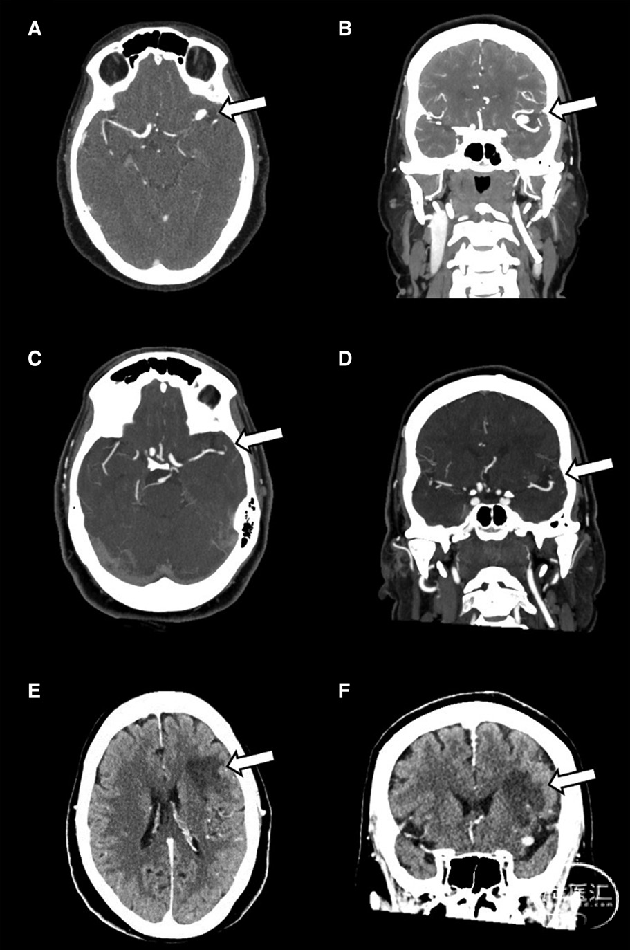 CTA(图2)显示左侧M2分叉处囊性动脉瘤。图A和B,动脉瘤内高信号(造影剂)。图C和D,血栓形成后动脉瘤内低信号。图E和F,左侧M2上干梗死: