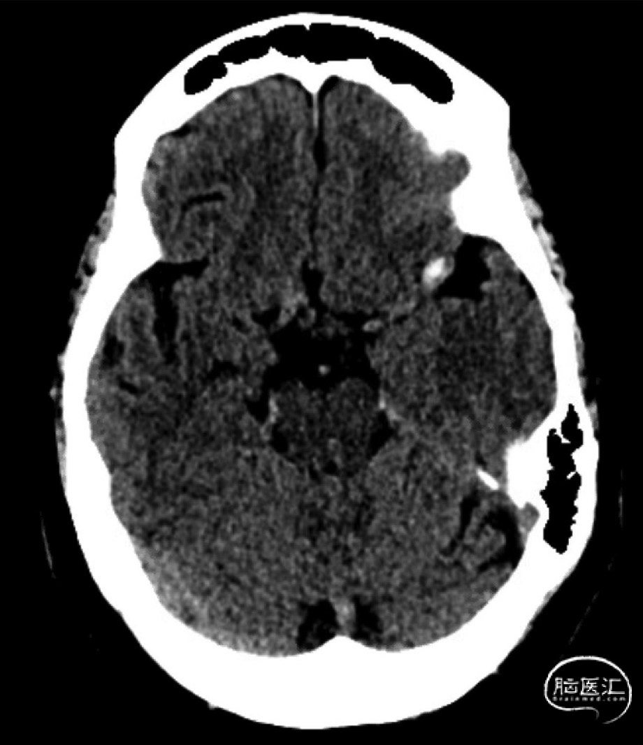 平扫CT(图1)可见MCA局部高密度信号为动脉瘤内血栓形成: