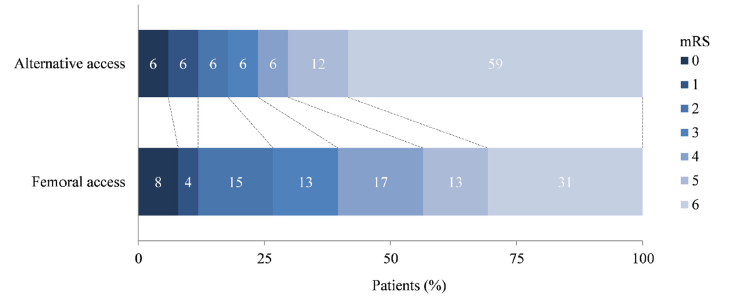 图2. 经替代动脉和股动脉入路行EVT治疗患者的90天mRS评分情况