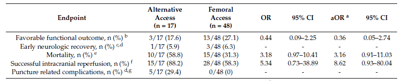 在MR CLEAN注册数据库中,共有5193名患者符合标准被纳入本研究,其中17名患者通过替代动脉入路进行EVT治疗(颈总动脉15例和肱动脉2例),并与48名通过股动脉入路接受EVT的患者相匹配(图1)。患者基线资料详见表1。在主要有效性终点方面,采用替代动脉入路进行EVT治疗较经股动脉入路有更差的良好功能预后率(18% vs 27%;aOR=0.36;95% CI,0.05-2.74)(图2)。尽管通过替代动脉入路进行EVT治疗,AIS患者再灌注成功率较股动脉通路更高(88% vs 58%);然而,通过替代动脉入路治疗后的患者死亡率(59% vs 31%)和穿刺相关并发症发生率(29% vs 0%)更为常见(表2)。