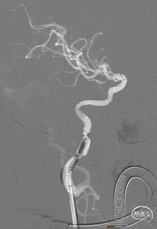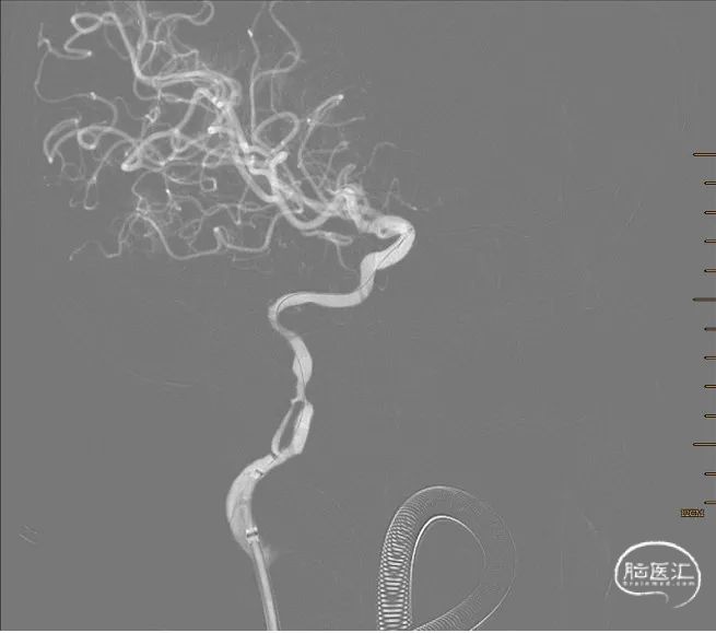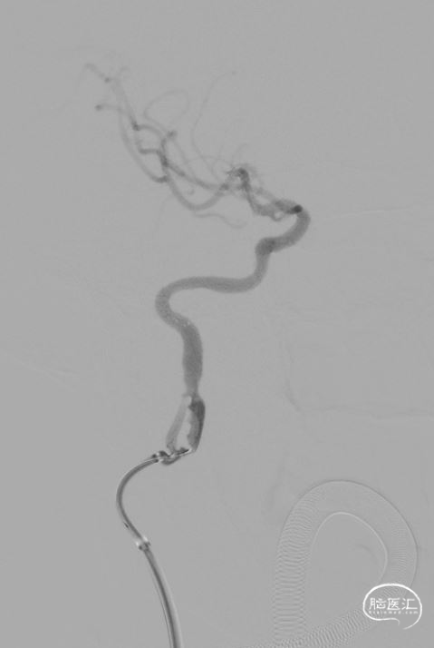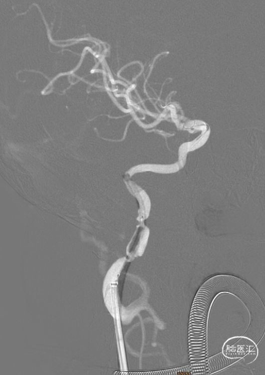 沿微导管送入取栓支架(6mm*30mm),准确对位后成功释放,撤出微导管,造影提示右侧颈内动脉及右侧大脑中动脉有前向血流,等待5分钟后,跟进颅内支持导管至颈内动脉C2段,缓慢回撤取栓支架,并沿中间导管抽吸,可见支架缠绕少量血栓,送入Synchro-2 微导丝3m至C7段,回撤中间导管,再次造影提示右侧颈内动脉C1段重度狭窄伴夹层样改变,观察10分钟血流较前减慢。