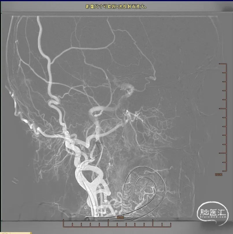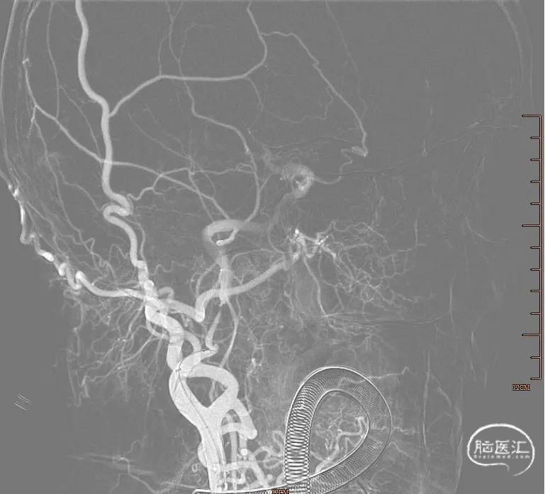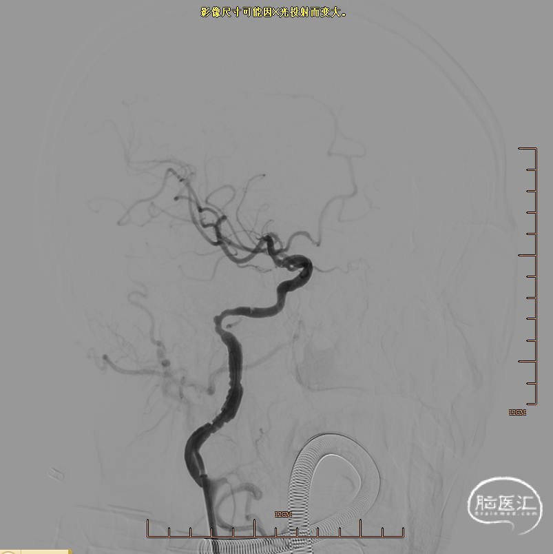 观察十分钟后再次造影提示右侧颈内动脉全程血流通畅,无明显急性血管闭塞征象,前向血流3级。术中DynaCT未见明显造影剂渗出。撤出导引导管,拔除动脉鞘,使用雅培缝合器 ProGlide缝合伤口,伤口加压包扎,结束手术。
