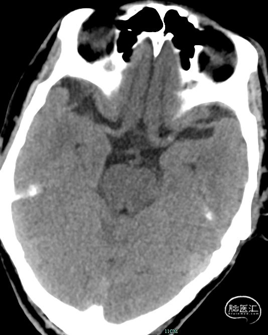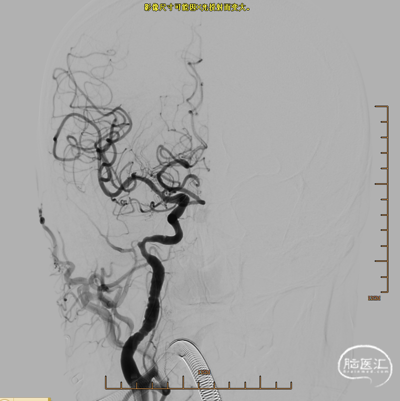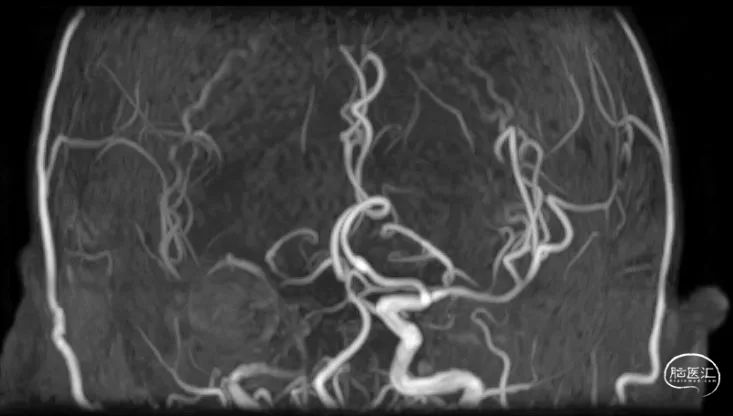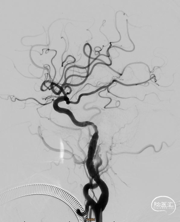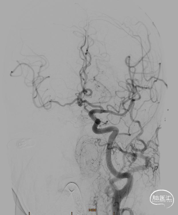 为进一步评估梗死大小和颅内情况,磁共振显示颈内动脉闭塞,小的核心梗死。