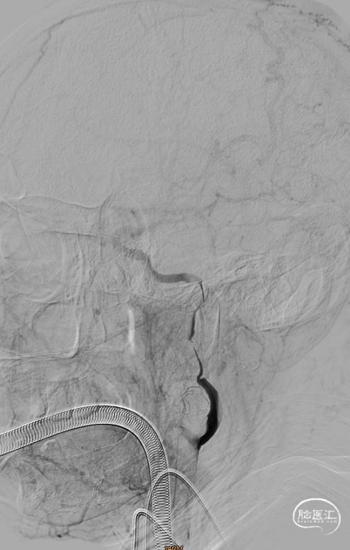 右股动脉处置入8F 股动脉鞘,分别沿鞘送入泥鳅导丝、5FH1动脉造影导管造影提示右侧颈内动脉C1段闭塞,考虑右侧颈内动脉夹层。