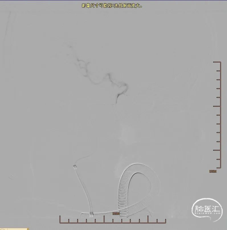 路径图下将微导丝的先端小心通过右侧颈内动脉C1段闭塞段置于C5段,跟进微导管顺利通过颈内动脉闭塞段。