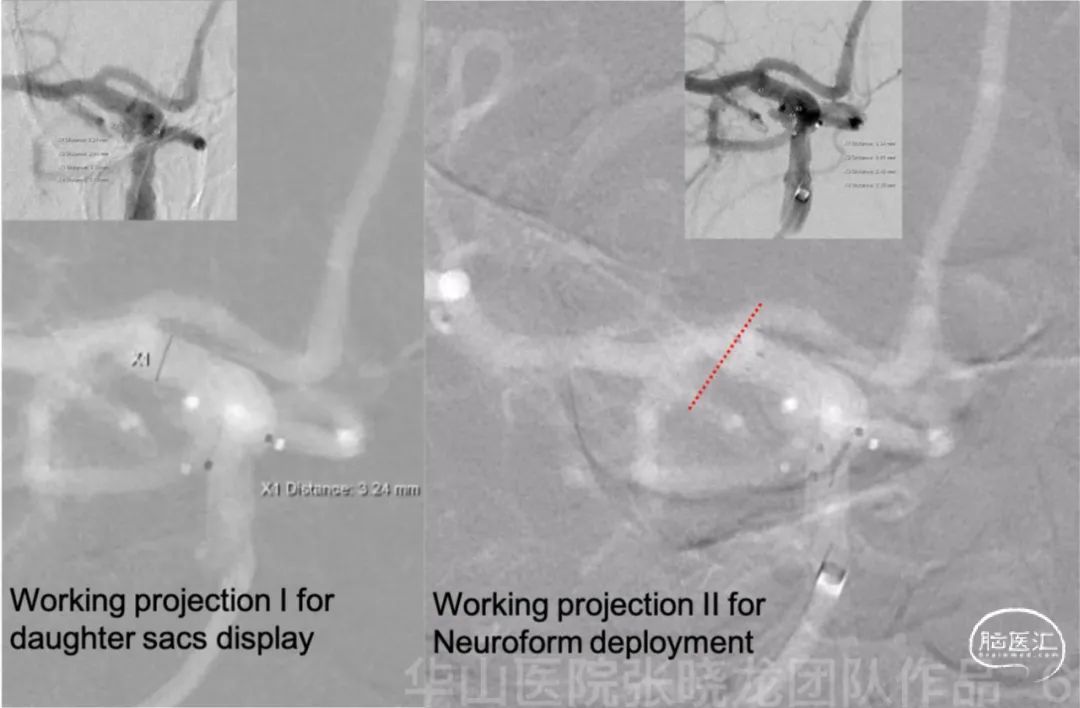 选择合适的工作角度(多个工作角度),能清楚显示子瘤和动脉瘤颈部。