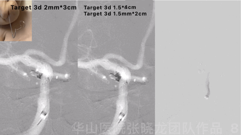 图 8 GIF. Echelon-10重新塑螺旋形后超选入动脉瘤腔内,依次填入3枚弹簧圈(Target 3d 2mm*3cm, 1.5mm*4cm, 1.5mm*2cm)。复查造影动脉瘤致密栓塞,载瘤动脉通畅。