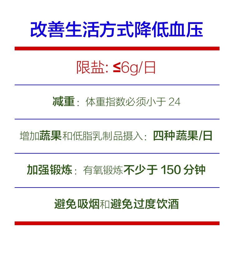 推荐所有高血压患者接受非药物措施,包括:限盐,减重,增加新鲜水果、蔬菜和低脂乳制品摄入,加强锻炼,避免吸烟,避免过量饮酒。