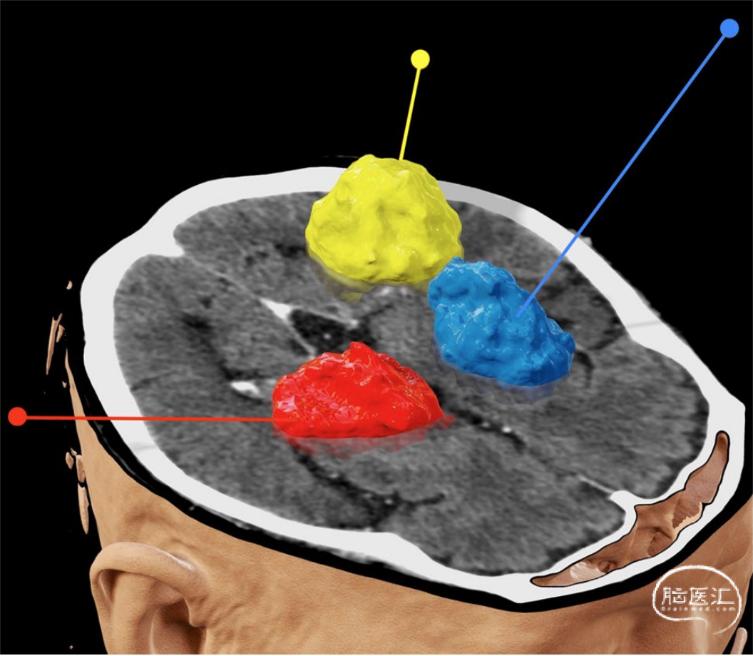 图1. 脑出血的手术路径示意图。基底节区血肿(蓝色肿块)经额点(蓝线)入路。丘脑血肿(红色肿块)通过顶骨点(红线)入路。脑叶血肿(黄色肿块)通过最近的皮质点(黄线)入路。