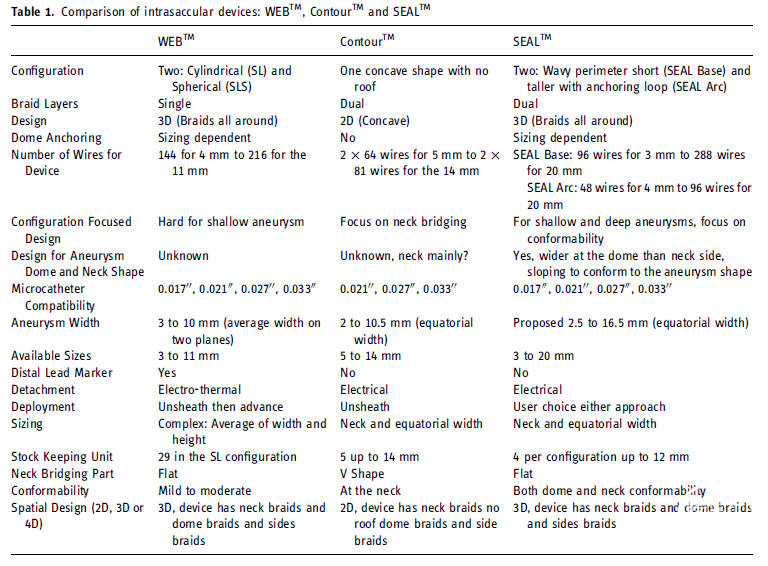 表1. 动脉瘤瘤内装置比较:WEB,Contour和SEAL™。