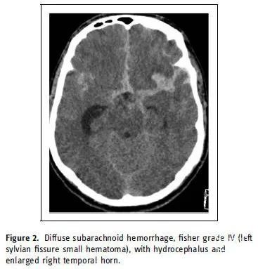 图2. 弥漫性蛛网膜下腔出血,Fisher IV级(左外侧裂小血肿),伴脑积水和脑室右颞角扩大。