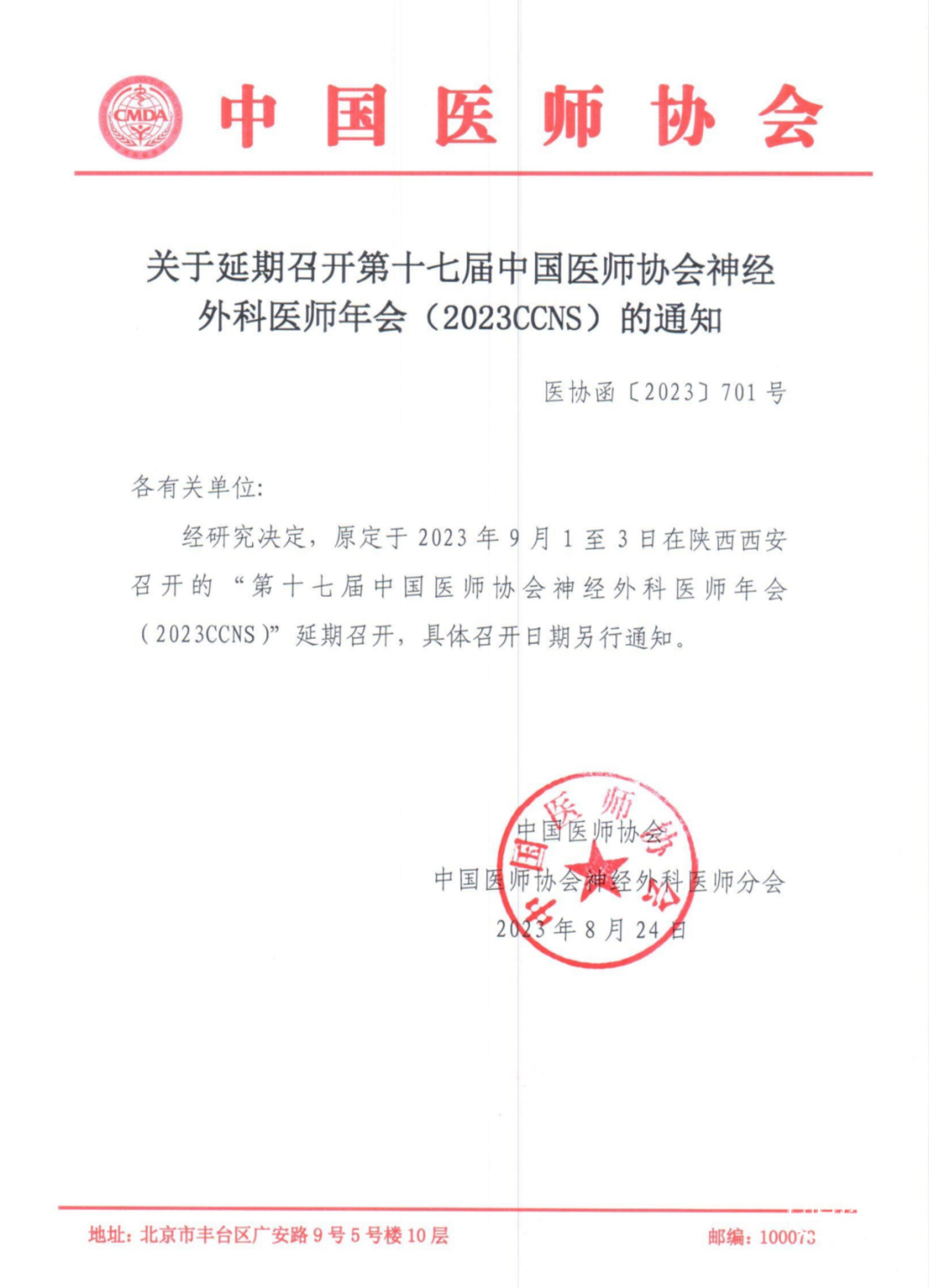 经研究决定,原定于2023年9月1至3日在陕西西安召开的“第十七届中国医师协会神经外科医师年会(2023CCNS)”延期召开,具体召开日期另行通知。