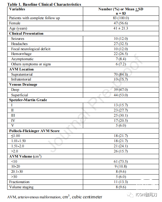 我们的数据库审查结果确定了92例连续患者。9例患者失访。因此,本研究共纳入83例患者。其中平均年龄41.0+21.3岁,女性47例(56.6%)。22例(26.5%)患者有AVM破裂。28人(33.7%)有吸烟史(现在或过去)。13例(15.7%)存在幕下AVM。10例(12.0%)有癫痫发作史。另有10例(12.0%)表现为局灶性神经功能障碍。S-M分级I、II级AVMs 36例(43.4%),S-M分级III、IV级AVMs 42例(50.6%),其余为V级(n=5[6%])。18例(21.7%)的Pollock-Flickinger得分在1分及以下,18例(21.7%)为1.01-1.50分,21例(24.1%),26例(15.7%)为2.0分。平均边缘剂量为22.0 Gy(范围18 - 25 Gy)。研究人群的基线临床特征见表1。