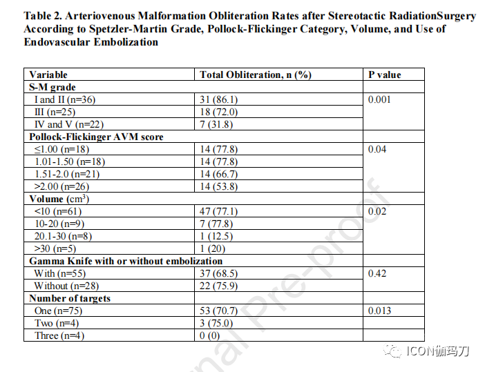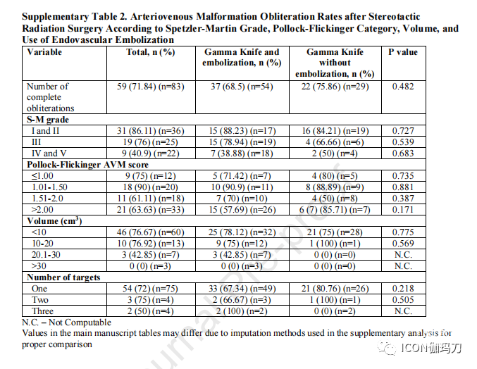 在本病例系列中,S-M分级I和II、III、IV和V级的闭塞率分别为86.1%、72.0%和31.8%。这些结果与文献报道的结果相当。根据Kano等人的大型SRS治疗系列,4年时S-M I级和II级的完全闭塞率为87%。两项国际多中心研究报告了S-M III级AVMs在5年完全闭塞率为63%,S-M IV和V级AVMs在3年完全闭塞率为15%。另一项国际多中心研究显示,IV级和V级动静脉畸形3年的闭塞率为37%,12年的闭塞率为42%。虽然在单变量分析中,靶区数、S-M分级和Pollock-Flickinger评分与AVM闭塞有统计学显著相关,但在多变量分析中,AVM体积是AVM闭塞失败的唯一独立预测因子。这是由于畸形血管巢体积与S-M分级、波洛克-弗利金格分数和靶区数的共线性(the collinearity of nidal volume with S-M grades and Pollock-Flickinger scores and number of targets.)。在对治疗前有无栓塞的伽玛刀SRS的单变量分析中,没有统计学上的显著差异:66.2%的患者在栓塞后获得治愈,而75.9%的患者没有栓塞,P=0.48(表2)。