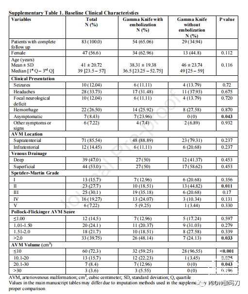 栓塞的决定是基于多种因素,包括存在的与血流相关的脑动脉瘤和畸形血管巢内动脉瘤。对于大尺寸AVM ,进行栓塞以减小病灶大小。该计划在多学科会议上进行了讨论,供血动脉的可及性和栓塞的安全性是影响栓塞决定的主要因素。关于首选治疗方式或治疗方式组合的决定是通过共识达成的,并基于几个因素,包括年龄,临床表现,位置,S-M AVM分级,供血动脉和引流静脉的模式,以及患者的偏好。通常单独使用SRS治疗小的AVMS(小于3cm)。对于较大的(>3cm)或具有高危特征(如畸形血管巢内动脉瘤或静脉狭窄)的较小AVM,在SRS之前尝试栓塞。对于本研究中纳入的患者,显微手术切除是保留给有或没有血管内栓塞的SRS治疗后AVM闭塞失败或出血。先期接受显微手术治疗的患者未纳入本研究。