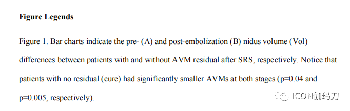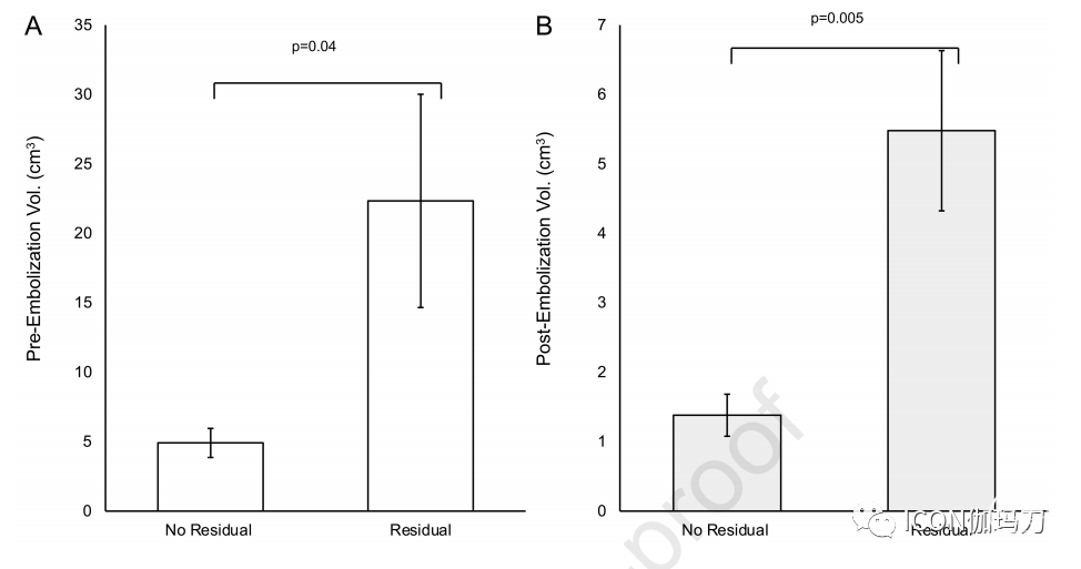 图1。柱状图分别显示了SRS治疗后存在和不存在AVM残留的患者畸形血管巢栓塞(A)和栓塞后(B)体积(Vol)差异。请注意,在以上两个阶段无残留(治愈)患者的AVMs都明显较小(分别p=0.04和p=0.005)。