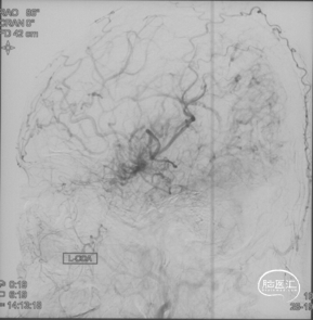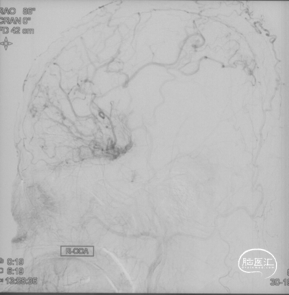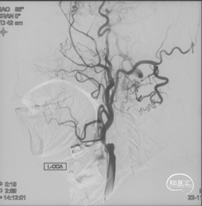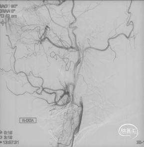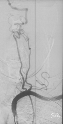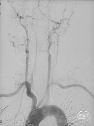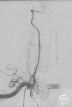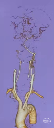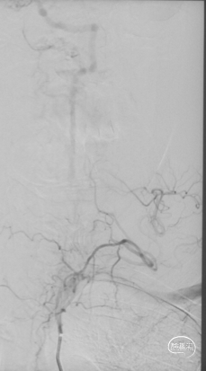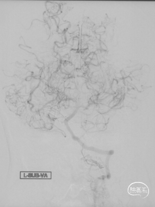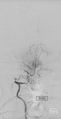 CTA和DSA所见:双侧颈内动脉闭塞,右侧椎动脉发出PICA后闭塞,左侧椎动脉V1-V2段闭塞。两条健壮的侧枝通过肌支吻合汇入左椎动脉V2段,构成了整个大脑大部分供血的主要来源。双侧颈外动脉亦有少量血流供应颅内。这样的颅内供血很容易发生失代偿,导致TIA甚至脑梗。