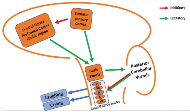 强哭强笑的确切病理生理机制尚不明确。 目前推测强哭强笑的可能机制是,情感表达的脑干运动系统的下行控制系统损害所致。在脑干负责哭笑的中心与上级神经联系损伤时可能发生强哭强笑。脑干、额叶、顶叶等不同部位损伤导致的具体症状不完全相同。 小脑在强哭强笑发生机制中也逐渐受到重视,Parvizi提出皮质-脑干-小脑环路,认为此环路的破坏与强哭强笑的发生有关。 根据STAR试验及其扩展试验(PMID:20839238)的研究结果,2010年美国FDA批准了“右美沙芬/奎尼丁(20/10mg)复合制剂”用于强哭强笑的治疗。 与安慰剂对照组相比,每日两次的“右美沙芬/奎尼丁(20/10mg)”可以使强哭强笑的发作频率减少49%。但是该复方制剂目前尚未在我国上市。 此外,在一些研究中,发现三环类(阿米替林等)和SSRI类(舍曲林、西酞普兰等)抗抑郁药物对强哭强笑也有效。但目前这些药物的使用尚属于off-lable。 声明:脑医汇旗下神外资讯、神介资讯、神内资讯、脑医咨询、Ai Brain 所发表内容之知识产权为脑医汇及主办方、原作者等相关权利人所有。