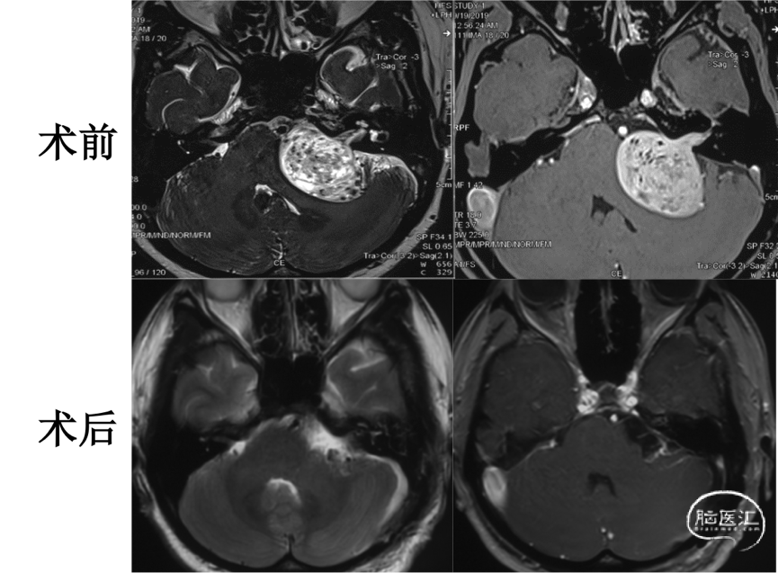 术后复查头颅MRI显示肿瘤全切,小脑无明显牵拉损伤。