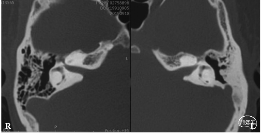 CT骨窗位显示左侧内听道扩大,同时了解乙状窦、乳突导静脉位置及岩骨气化情况。