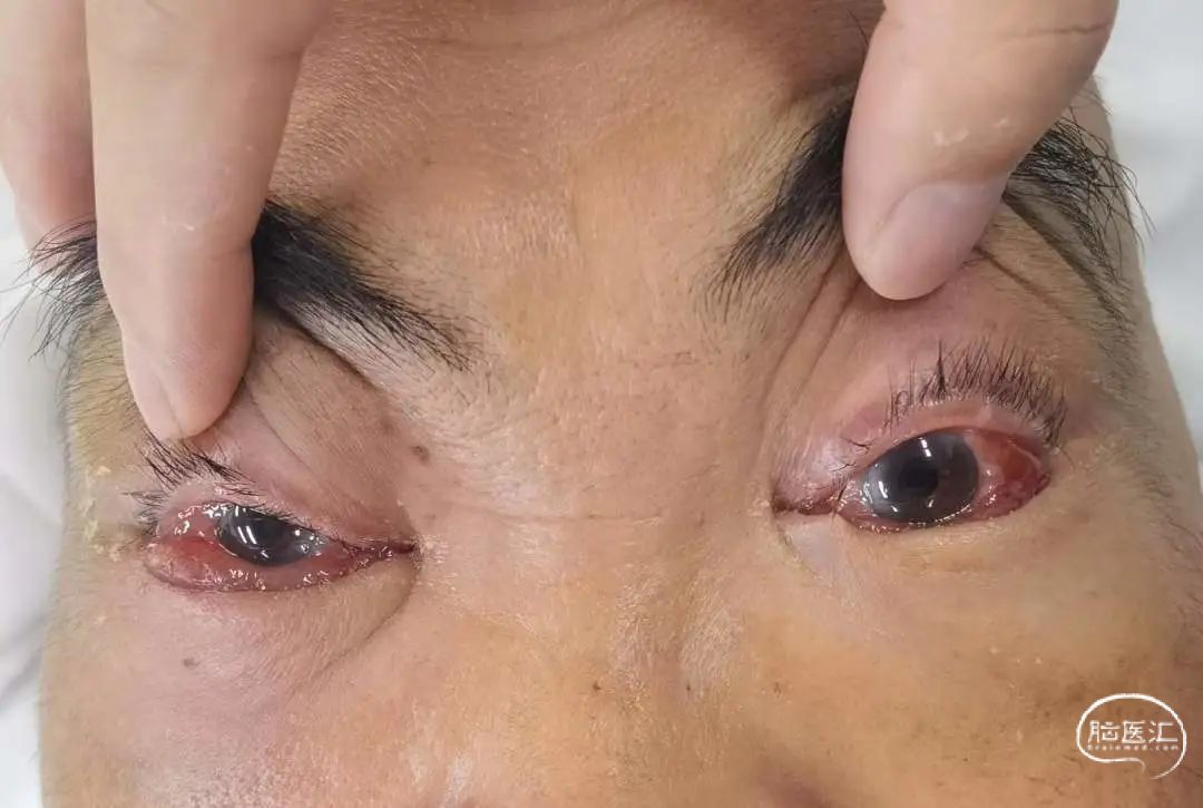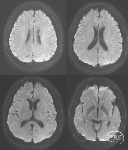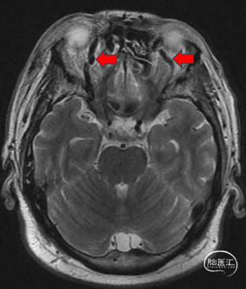 头颅核磁DWI未见急性梗死,T2加权像见双侧增粗眼静脉。
