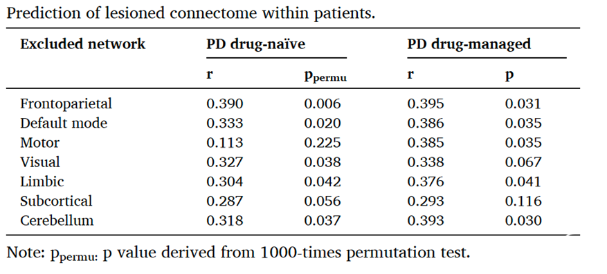 “缺损”功能连接组结果提示(表1),在剔除运动网络、视觉网络和皮层下网络后,功能连接组不能够预测未服药或服药中患者步行时间。提示上述三个网络在PD步态调控中起到重要作用。