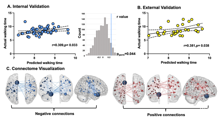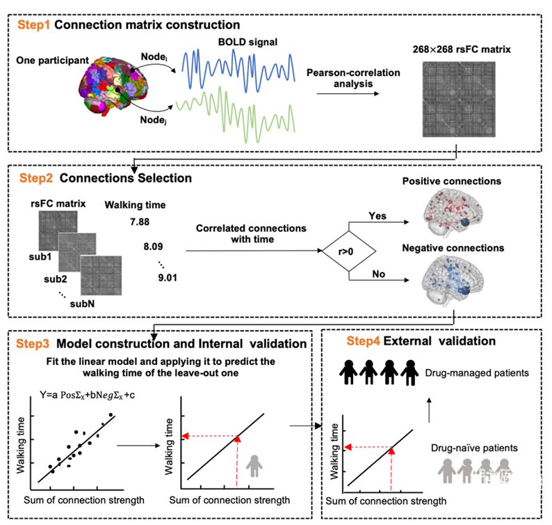 本研究共纳入78位PD患者(48位未服药患者,30位服药中患者)。根据10米步行测试时间评估步态,同时采集Rs-fMRI数据用于构建功能连接矩阵。采用基于功能连接组预测模型构建法(CPM)和留一交叉验证法在首诊未服药患者中构建步态相关功能连接组,并在服药中患者中进行验证(图1)。用于构建连接组的功能连接根据其强度与功能连接的相关系数,分别归为负相关(r<0)和正相关(r>0)功能连接,并依照所属节点位置分别归为7个功能网络,进一步分析网络内、网络间功能连接模式与PD步态的关系。同时纳入33位对照,比较PD与对照组步态相关功能连接组连接模式,探索PD病理对正常步态调节机制的影响。