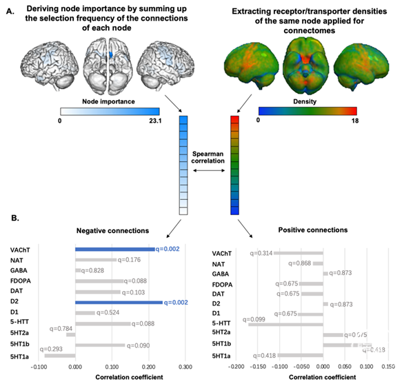 连接组与神经递质受体/转运体密度分布图谱空间相关性通过计算节点重要性与其对应位置受体/转运体平均摄取值的相关系数来进行评估。连接组节点重要性通过计算该节点所发出功能连接在交叉折叠验证过程中被选中频率的总和得到,被选中频率越高说明节点重要性越高,每个节点的重要性在正、负相关连接组中均进行计算。平均摄取值通过计算神经递质受体/转运体密度分布图谱中该节点对应位置所包含体素摄取密度的平均值得到,密度越高说明受体/转运体分布越密集。