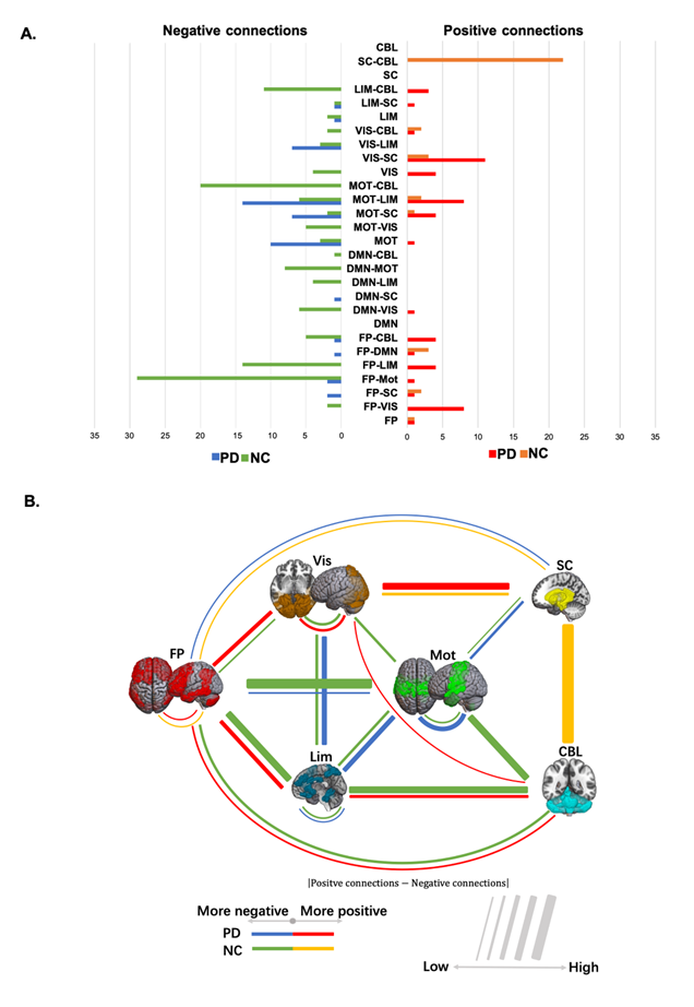 与正常对照相比,PD步态相关功能连接组负相关连接数目较对照组步态相关功能连接组减少(PD vs. 对照组=47 vs. 128,图3A);而正相关功能连接数目增加(PD vs. 对照组=54 vs. 36,图3A)。图3B显示两个功能连接组网络内、网络间正、负相关功能连接的差值,与对照组步态相关功能连接组相比,PD步态相关功能连接组非运动网络间连接多以正相关连接为主;运动网络与非运动网络间仍以负相关连接为主,但与部分非运动网络间连接消失。