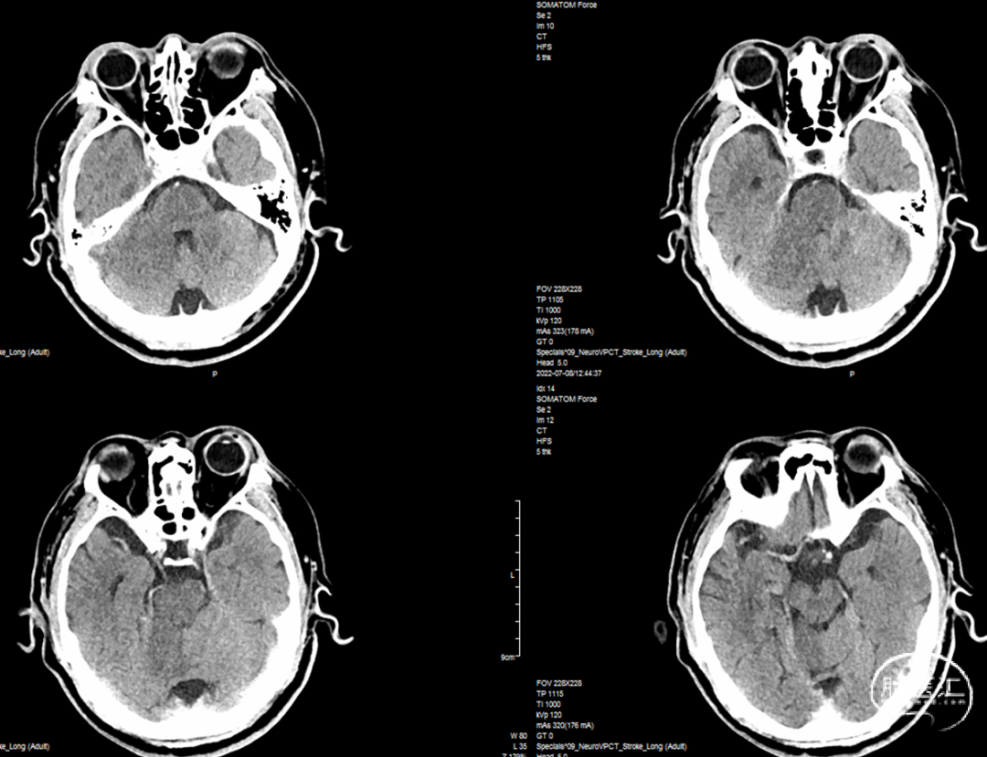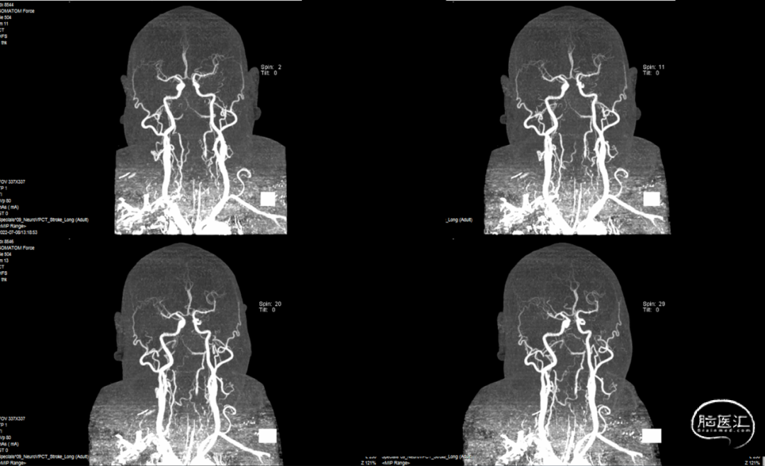 术后予以扩容等中性治疗,控制收缩压≤140mmHg。术后24小时CT见术区未出血(图20),术后24小时CTA+CTP显示基底动脉通畅,后循环灌注恢复(图21,22)。随即加用阿司匹林200mg QD。