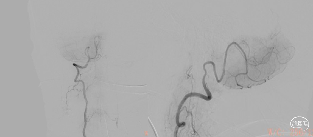综合术前辅助检查,(Core+pen)/Core=3.58;Pen>15ml;Core<70ml(图3);发病时间小于24小时,存在取栓指征,但是当地医院手术经验告诉我们左侧椎动脉慢性闭塞,且开通异常困难,常规手术方案很难成行,术前制定合理且可行的手术方案至关重要。方案1:仍采用左侧椎动脉+基底动脉取栓的正向开通方案,可能会继续浪费大量时间,甚至最后以失败告终。方案2:采用右侧椎动脉入路,由于右侧椎动脉V4段发育不良,当地医院已尝试过超选,证实无法通过V4段至基底动脉建立取栓通路。方案3:既往有文献报道开颅椎动脉直视下穿刺取栓,虽然方案可行,但我院无类似手术经验,贸然尝试风险难以把控。方案4:回顾当地医院取栓影像资料,发现双侧颈内动脉后交通呈胚胎型,是否可能通过后交通跨循环逆向超选至基底动脉取栓。患者平卧DSA床,全麻插管成功后,用碘伏常规消毒手术区皮肤,铺无菌巾单。取双侧股动脉为穿刺点,于14时00分seldinger法穿刺成功后分别置入8F穿刺鞘和5F 短鞘。行全脑血管造影显示左侧椎动脉起始部闭塞,颈升动脉通过肌支代偿V2及以远的椎动脉血流,右侧椎动脉V4段发育不良,单纯供应右侧PICA,双侧后交通动脉胚胎型。(图9,图10)首先我们仍尝试传统入路进行超选左侧椎动脉,发现左侧椎动脉开口闭塞,斑块质地坚硬,微导丝微导管无法通过。短暂尝试无果后,迅速改为右侧椎动脉入路,发现将微导丝塑型成“J”型或成袢,均无法到达右侧椎动脉V4段,遂果断决定采用跨循环取栓方案。将5F VERT造影导管超选至左侧锁骨下动脉,进行正向血流监测。6F 90cm长鞘(cook)及5F 125cm Navien导管在泥鳅导丝带领下超选进入右侧颈内动脉岩骨段。随后将Rebar18微导管在Synchro2微导丝带领下超选至大脑中动脉,并将Navien带领至右侧颈内动脉交通段。微导丝微导管回撤至颈内动脉,路图下Synchro2微导丝带领Rebar18逐步通过右侧后交通动脉,再在透视下经右侧大脑后动脉P1段盲超选至基底动脉下段。(图11-13)手推造影确认Rebar18微导管已突破血栓段,并在基底动脉真腔内。(图14)经Rebar18释放一枚solitaire FR支架(4mm×20mm)覆盖血栓段。SWIM技术负压下抽拉支架1次,抽拉过程中时刻注意系统张力,逐步回撤支架同时适度回撤Navien释放张力,以保证Navien贴近后交通开口而不向后交通动脉内继续深入。撤出支架后,Navien原位保持负压约30秒。(图15)造影复查见基底动脉及其分支再通,支架取出少量血栓(图18)。于14时45分达到远端血流mTICI3级,10分钟后复查造影显示血管通畅,于14时55分末次造影见远端血流维持mTICI3级。(图16,17)术中Dynamic CT未见明显术区出血(图19)。遂缝合穿刺点,结束手术。手术顺利,术中病人情况稳定。术末血压115/58mmHg,脉搏70次/分,呼吸12次/分,氧饱和度100%。术毕送重症监护室。图9. 双侧椎动脉造影:左侧椎动脉起始部闭塞,左侧颈升动脉肌支和右侧椎动脉通过脊髓支代偿V2及以远的椎动脉血流;右侧椎动脉V4段发育不良,单纯供应右侧PICA