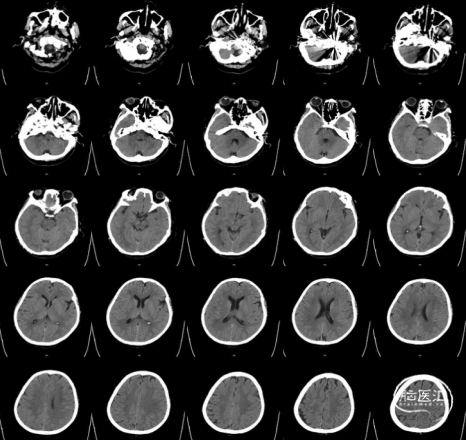 栓塞术后即刻CT未见颅内出血或Onyx胶异位栓塞。麻醉复苏后患者诉耳鸣消失,未诉其他不适,查体无新发神经系统体征。术后第二日,复查CT未见异常(图7),患者顺利出院。