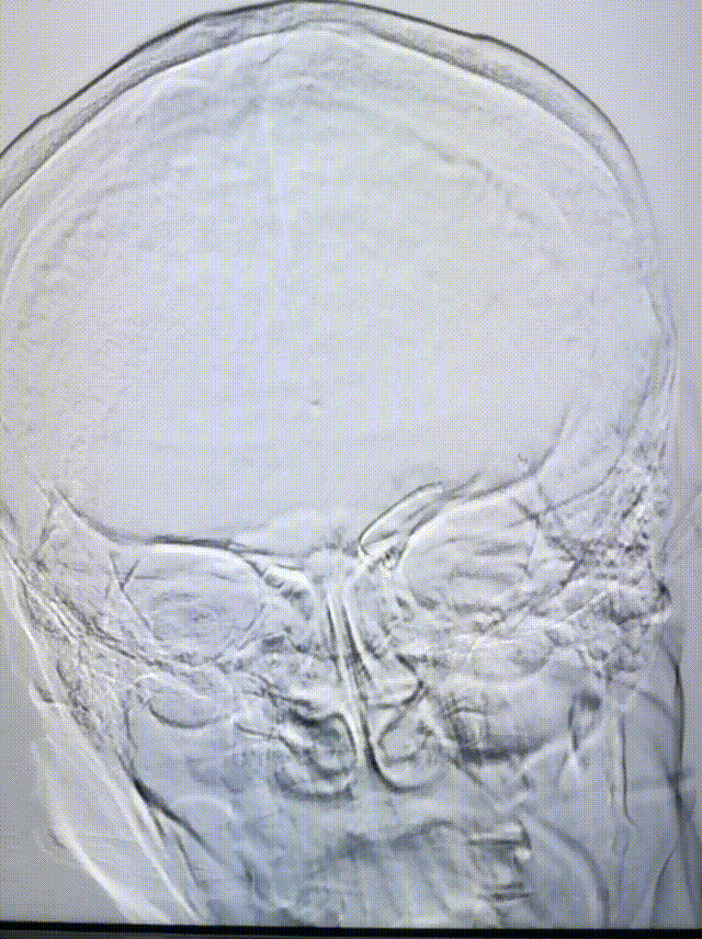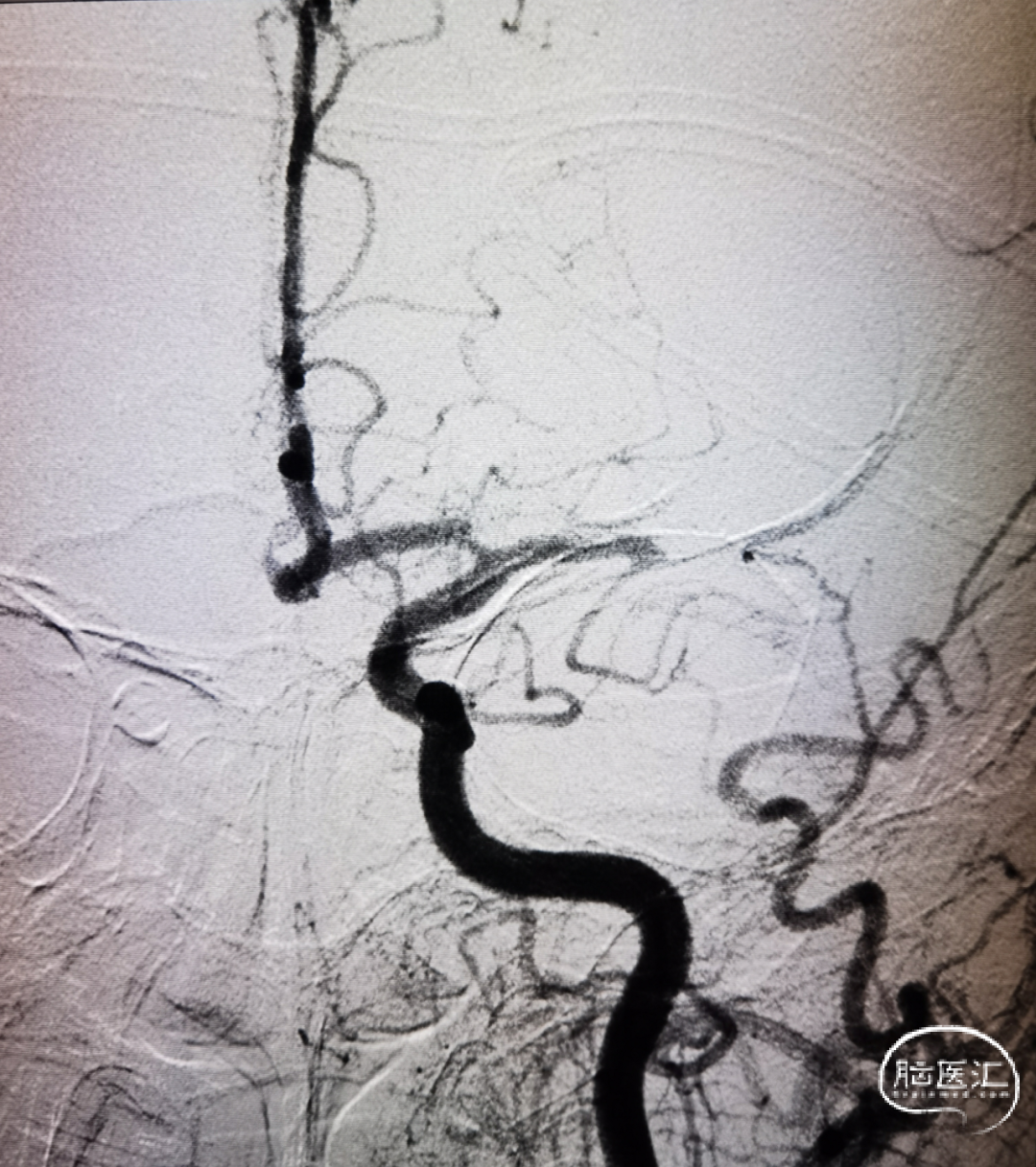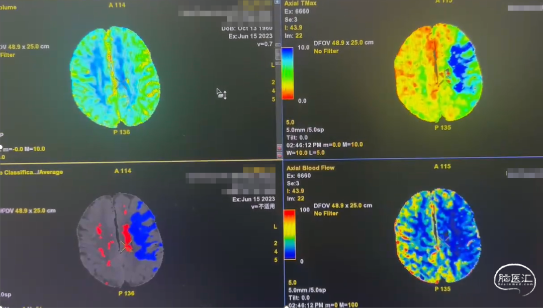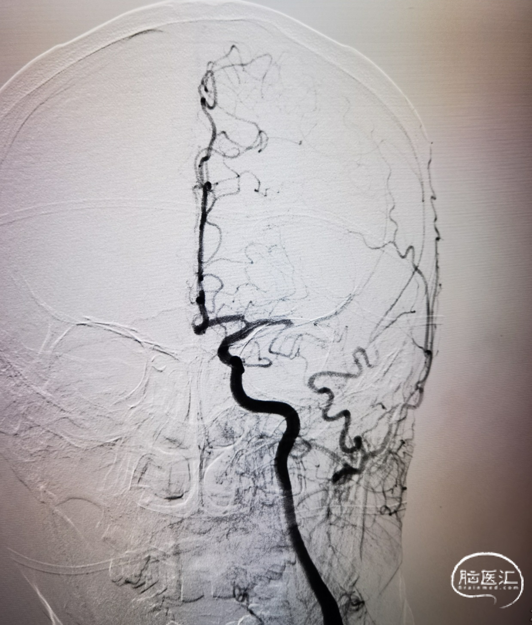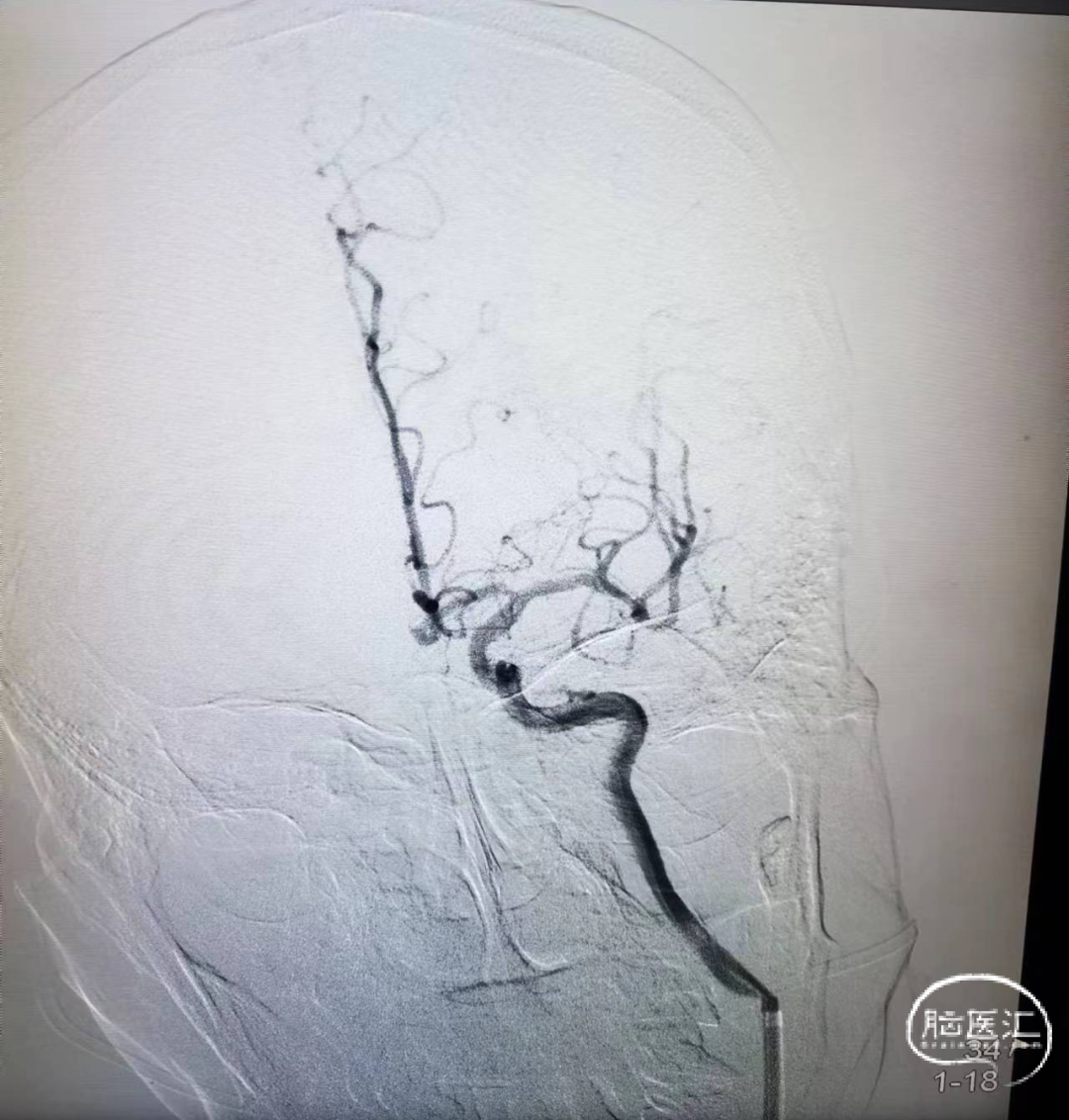 术中造影确认脑血流完全恢复,mTICI 3级,术后24小时复查头颅CT左顶叶少量渗出。
