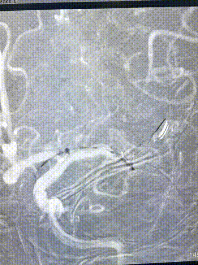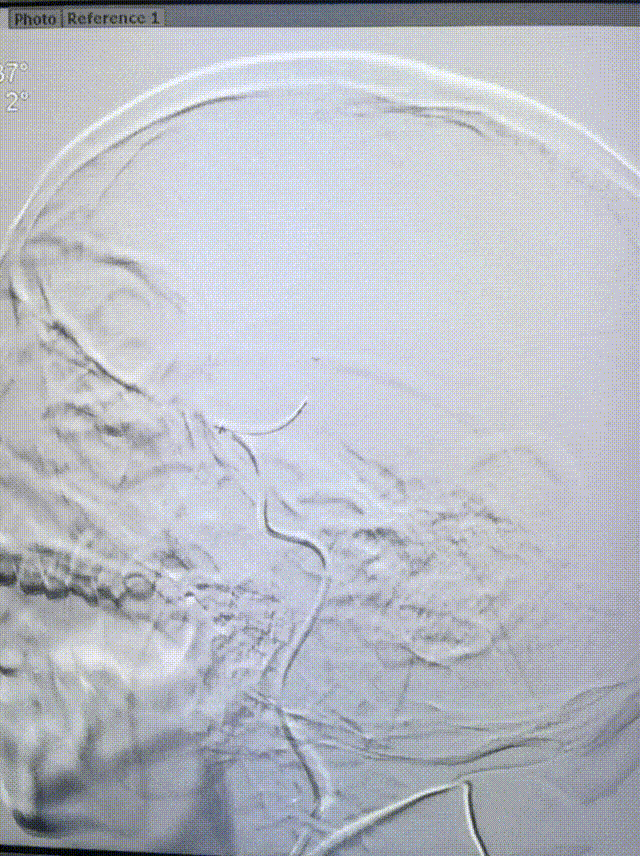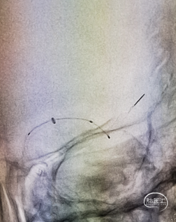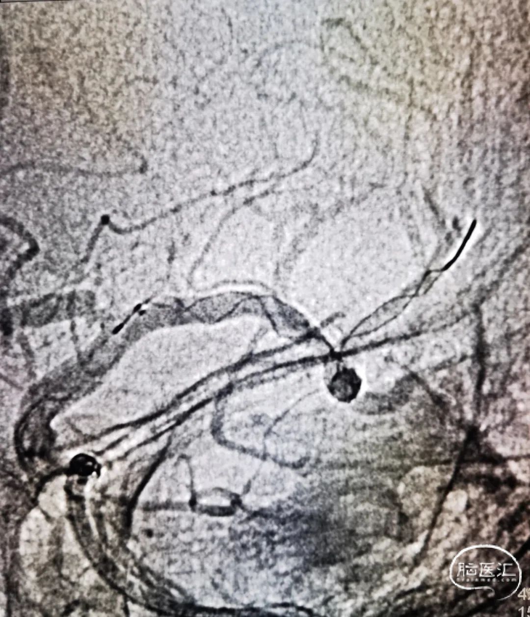 开通后血流再次闭塞,考虑球扩后夹层形成可能;补救性予以电解脱释放Solitarie支架后正侧位造影。