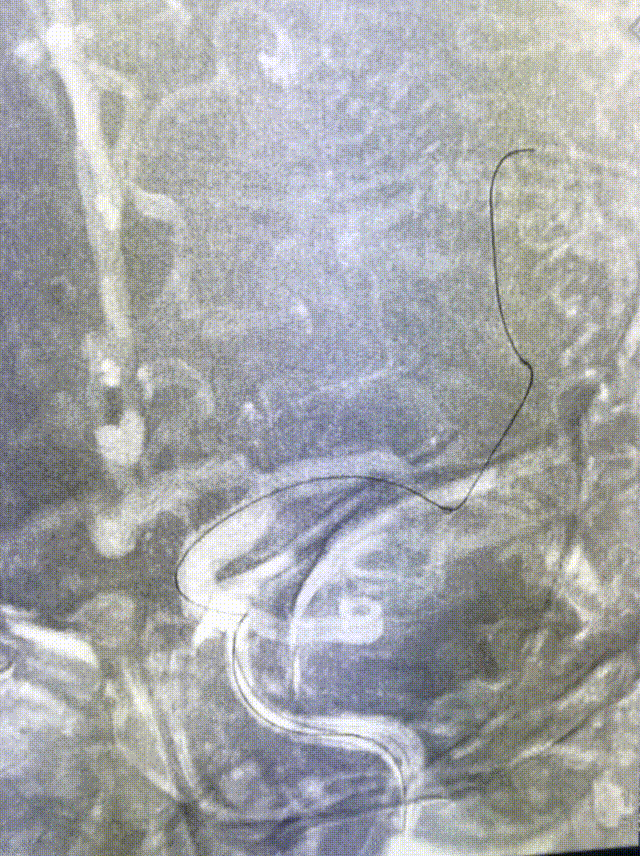 沿取栓支架的输送导丝送入SacSpeed®球囊扩张导管,将球囊置于狭窄段充盈球囊进行扩张。