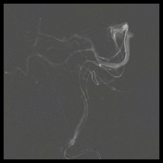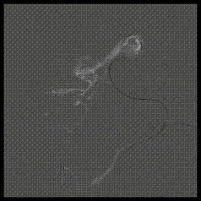 图4. 基底动脉尖动脉瘤支架辅助栓塞。A和B为headway21微导管超选到位录像;C和D为enchlon10微导管超选到达动脉瘤内并朝向动脉瘤子囊的造影图像;E和F为第一个成栏圈完成并完全释放LVIS支架后造影确认微导管朝向动脉瘤子囊的造影图像;G和H为完成基底动脉尖动脉瘤栓塞后的造影图像。I为LVIS支架按摩影像。