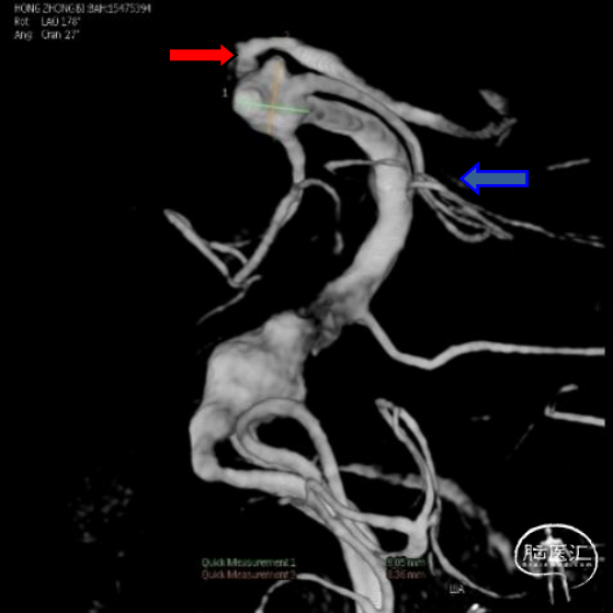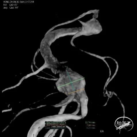 复查头颅CT提示广泛蛛网膜下腔出血,脑室扩张。基底动脉远端扩张请结合临床。急诊CTA提示:基底动脉两枚动脉瘤(图1)。