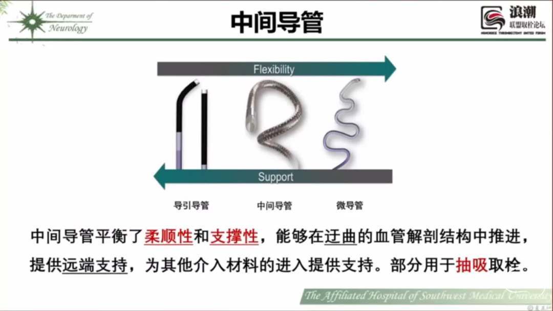 中间导管平衡了柔顺性和支撑性,能够在迂曲的血管解剖结构中推进,提供远端支持,为其他介入材料的进入提供支持。部分用于抽吸取栓。