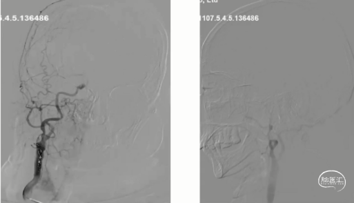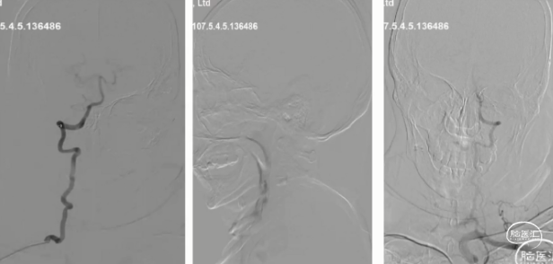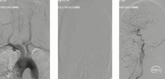 脑血管造影(主动脉弓及左侧颈内动脉2023-06-19):l型弓,左侧颈内动脉未见异常,前交通开放,右侧大脑前通过软脑膜支部分代偿