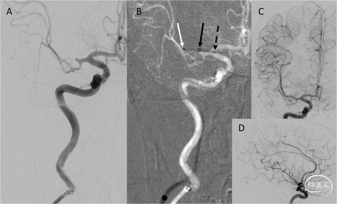 图3. 60岁患者,NIHSS 20分,ASPECTS 7分。A:右侧ICA正位造影提示右侧大脑中动脉M2闭塞。B:Tenzing 7输送(白色箭头为远端标记点,黑色虚线箭头为近端标记点)FreeClimp 70抽吸导管(黑色箭头)到位。正位(C)和侧位造影(D)显示抽吸取栓3min后实现了TICI 3级再通。