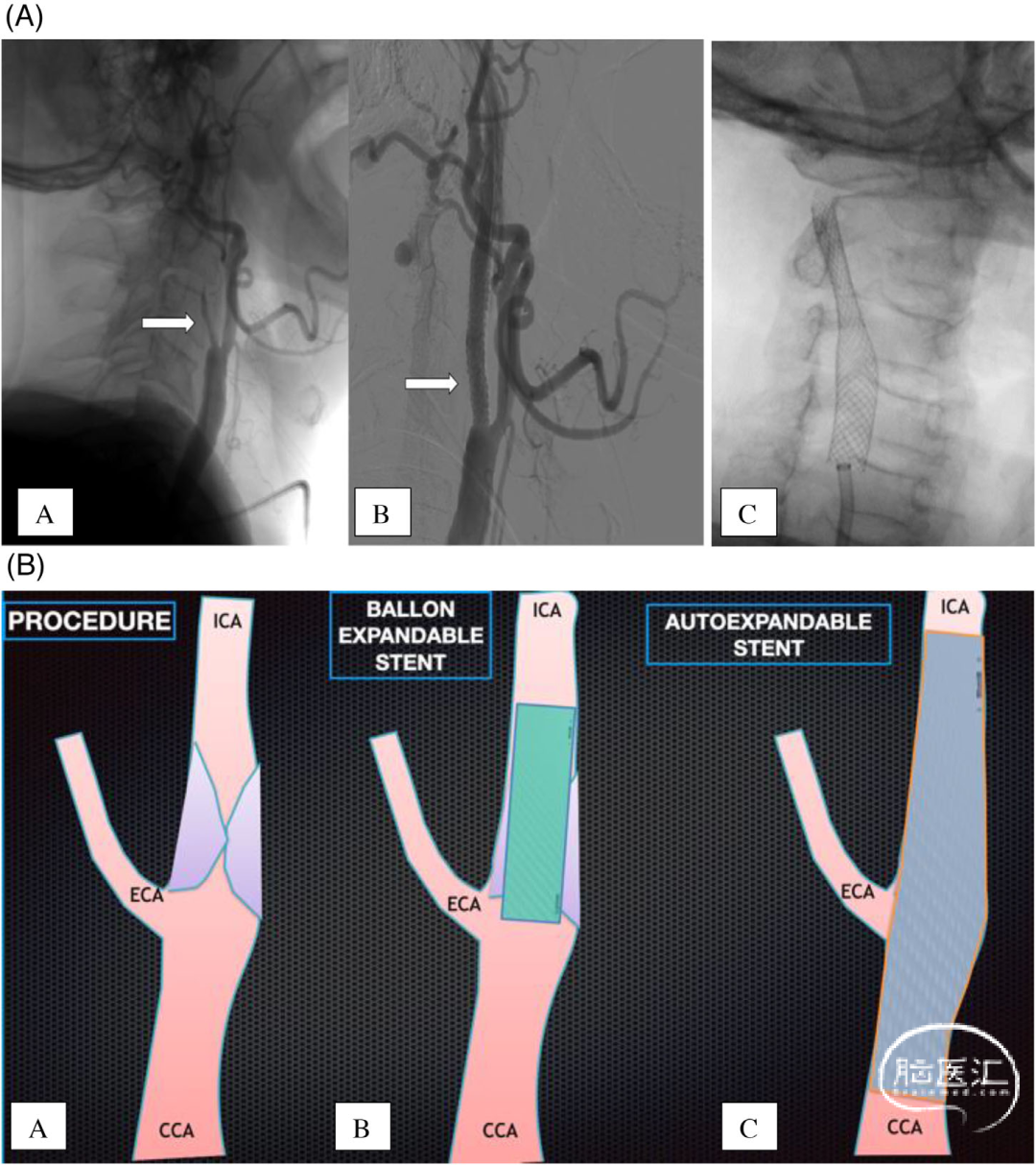 图1. 急性颈内动脉颅外段闭塞和球扩支架植入术。(A):A.右侧颈总动脉造影见颈内动脉起始部急性闭塞,B.球扩支架植入后造影可见颈内动脉血流恢复,C.另一个患者采用常规自膨支架植入。(B):A.急性颈内动脉串联狭窄病变引起急性闭塞,B.采用球扩支架植入术,只覆盖颈内动脉狭窄病变,C.再次采用自膨支架植入术,覆盖颈内动脉狭窄病变以及颈总动脉。