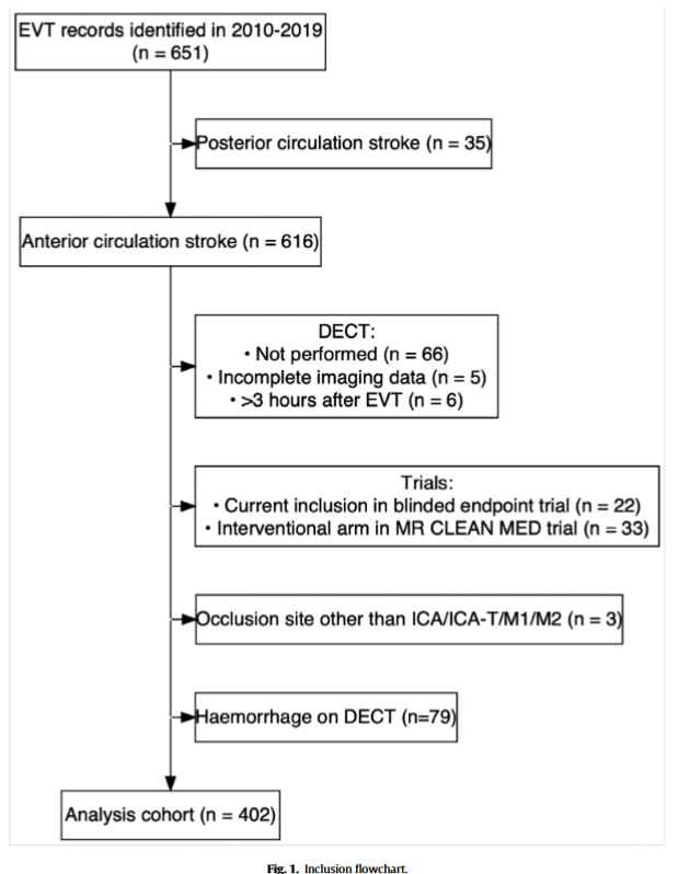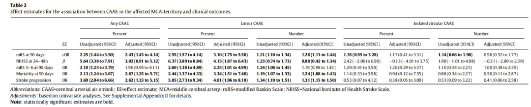 筛选了2010年至2019年间所有EVT记录。纳入基线CTA上颈内动脉、颈内动脉末端或大脑中动脉闭塞的患者。排除标准包括:EVT后3小时内未进行双能量CT(DECT),参加MR CLEAN LATE临床试验,以及EVT后立即发生脑出血(ICH)。DECT读片时采用软组织窗宽/窗位(W:400,L:40)使得CAAE 最清晰可见,在大脑中动脉(MCA)、大脑前动脉(ACA)和大脑后动脉(PCA)的血管区域中,对CAAE 进行计数,此外CAAE还被区分为线性和圆形,其中圆形被认为可以快速溶解,因而对患者的预后影响有限,而线性则会导致下游组织长期的有害影响。主要结果指标是术后90天mRS评分。次要结果指标是24−48小时的NIHSS评分、90天的二分类mRS评分(0−2与3−6)、90天的死亡率和卒中进展。卒中进展定义为神经功能恶化导致NIHSS评分变化大于4分,或NIHSS评分中有一项评分变化大于2分。在NIHSS随访评估时死亡的患者的NIHSS评分为42分。