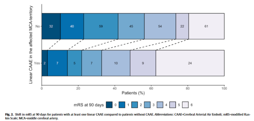 图2. 与没有CAAE的患者相比,患有至少一种线性CAAE的患者在90天时mRS的变化