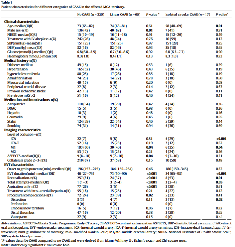 图1为流程图,最终有402例患者纳入分析,65名(16%)患者在MCA供血区发现了至少一个线性CAAE,中位数为3(IQR 2-6)。17名(4%)的患者发现了孤立的圆形CAAE,中位数为1(IQR 1-1)。在存在线性CAAE的患者中,32(49%)名患者还伴有环形CAAE。18名患者(4.5%)在MCA区域之外发现了线性 CAAE。13名患者(3.2%)在MCA区域外发现了孤立的圆形CAAE。无CAAE、线性CAAE和孤立圆形CAAE患者的基线特征见表1。与没有CAAE的患者相比,受影响的MCA区域中至少有一个线性CAAE的患者通常是男性,非M1段闭塞,基线ASPECTS较低。EVT持续时间较长,达到再通的可能较低,需要更多尝试以及更频繁地接受支架取栓。此外,与没有CAAE的患者相比,有CAAE患者的手术并发症更多。