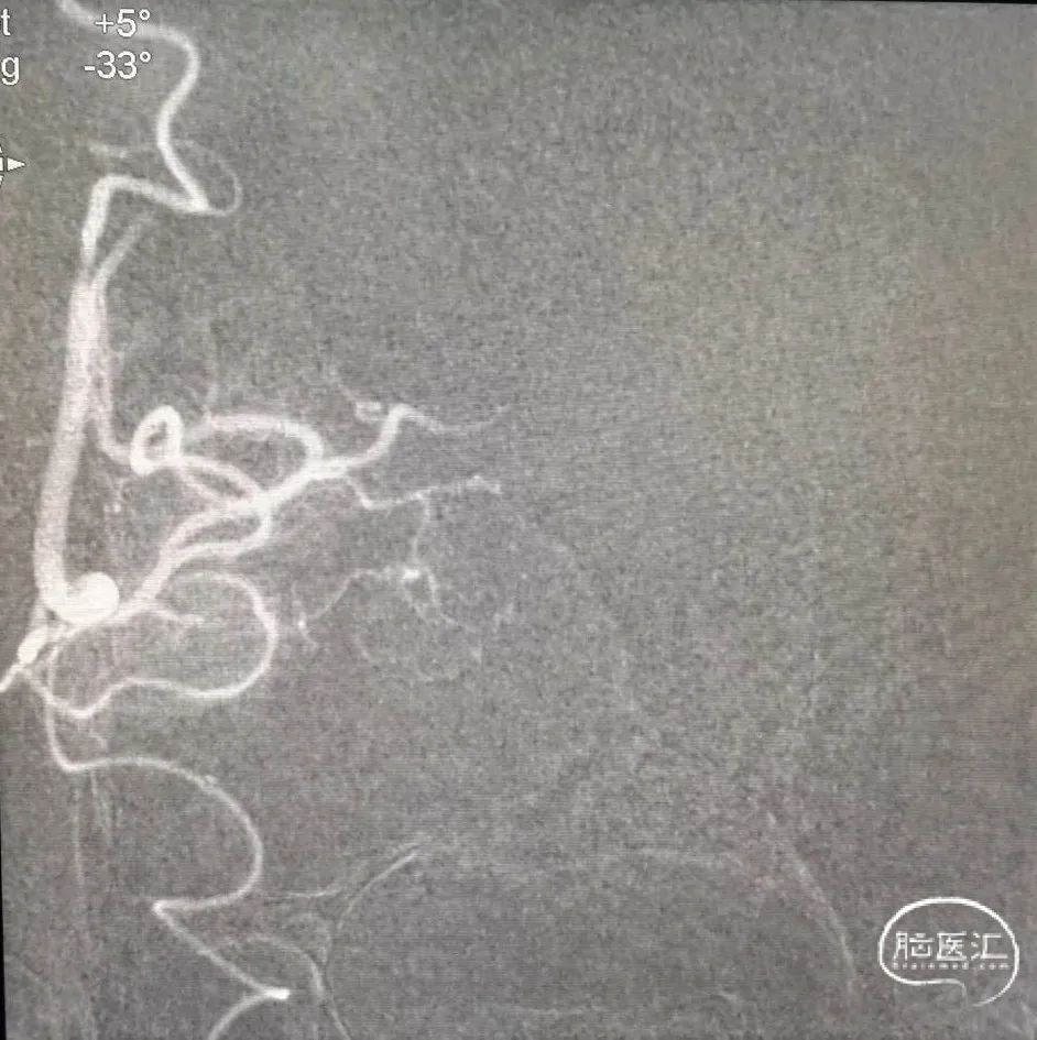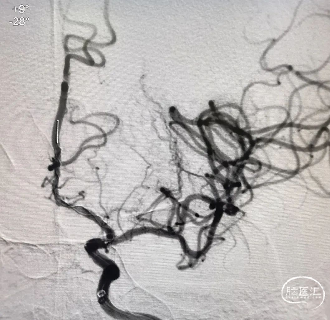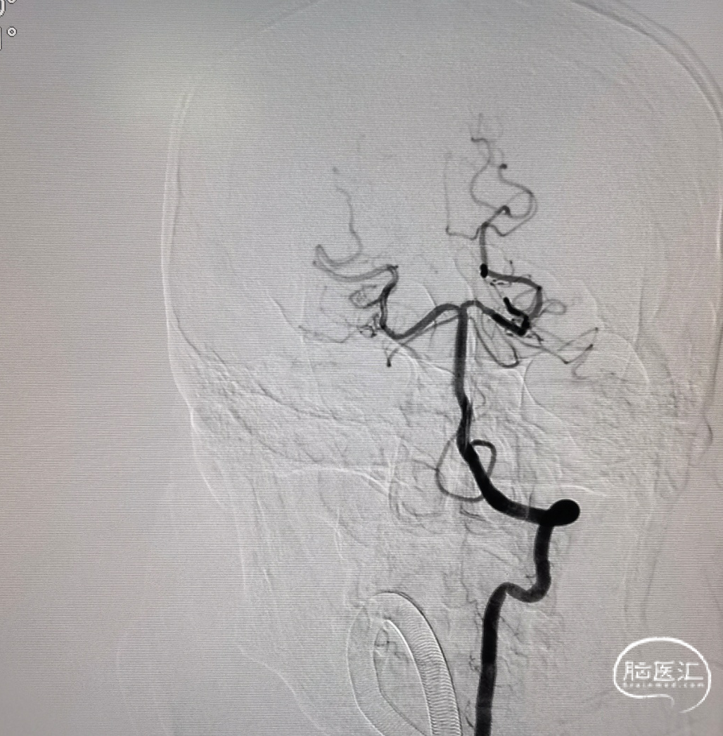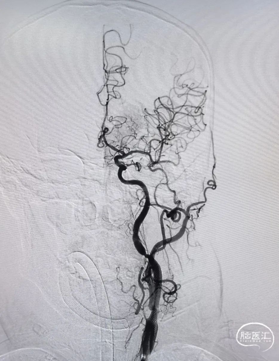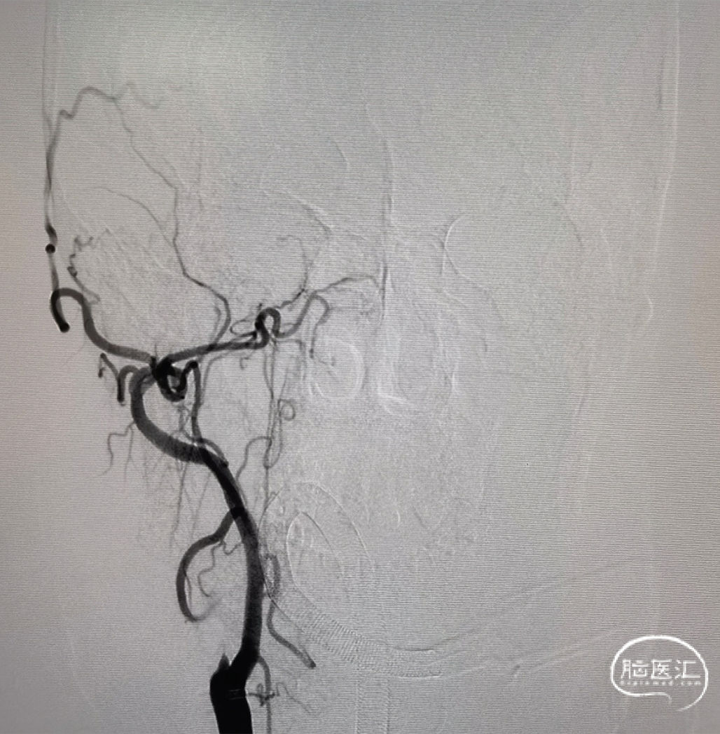 6F 115cm中间导管抽吸血栓2次后路图,见大脑中动脉、大脑前动脉闭塞。
