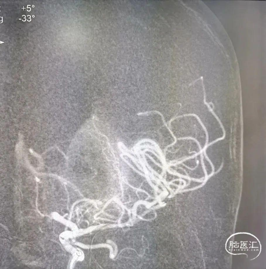 术后即刻CT:大脑纵裂高密度影,考虑出血(大脑前动脉超选困难,导丝损伤可能)。