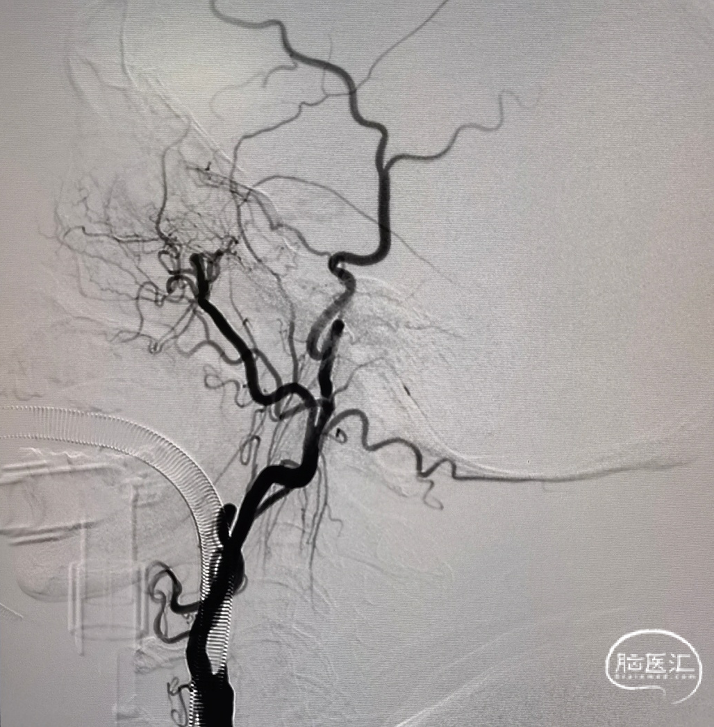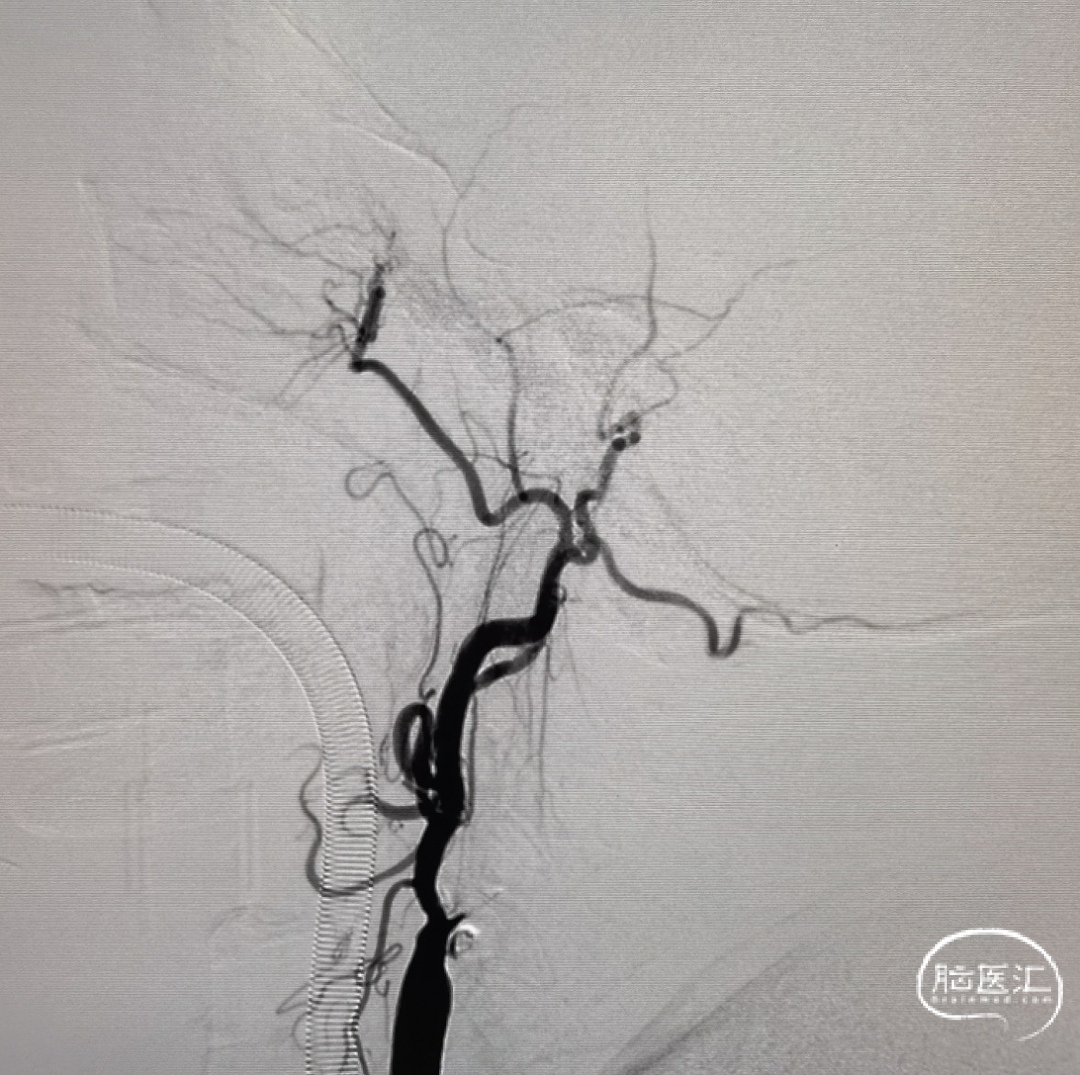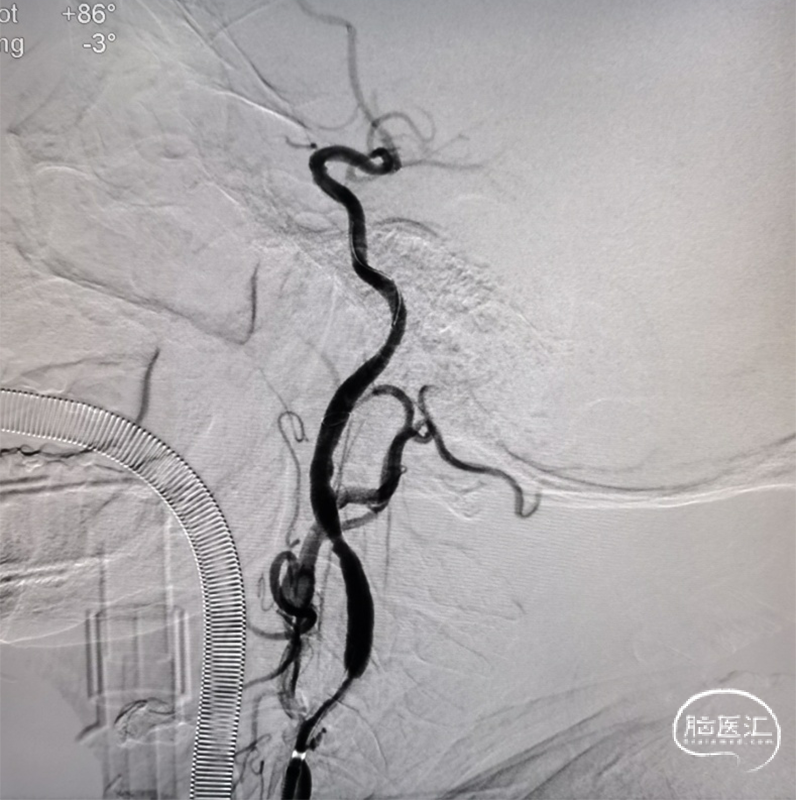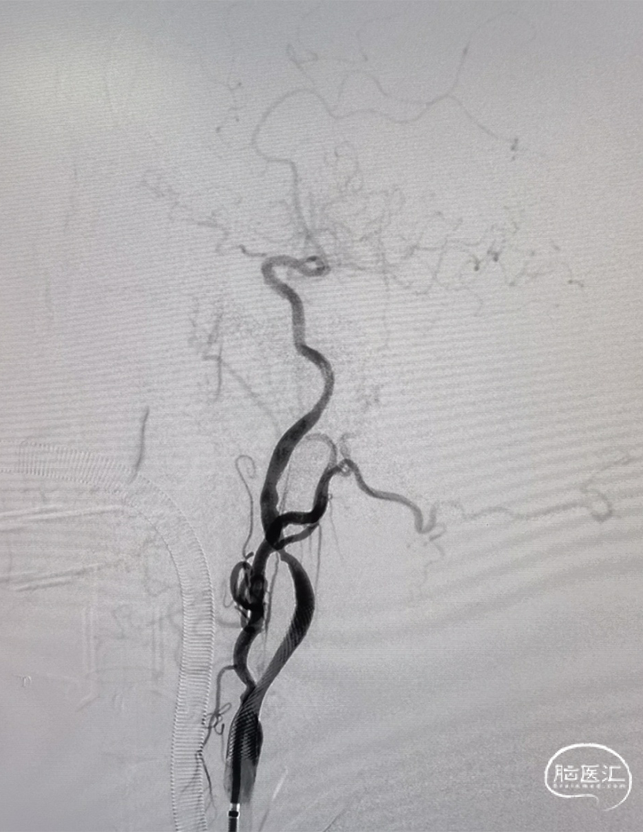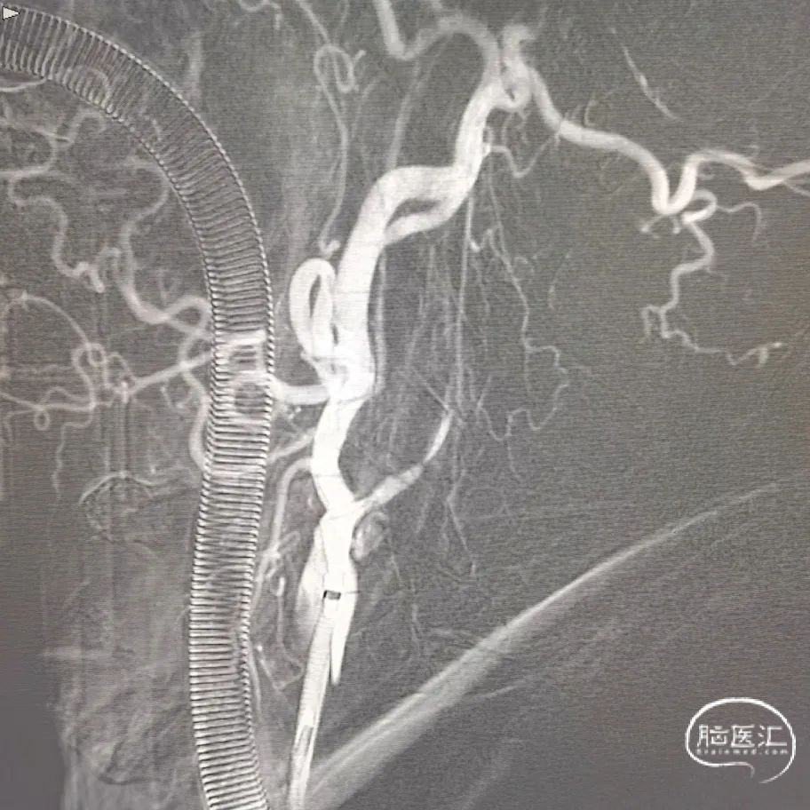 本例手术考虑颈动脉夹层,颈动脉慢性狭窄急性闭塞,术中使用泥鳅导丝+125多功能导管突破后立即使用6F 115cm中间导管于颈内动脉抽吸,2次均抽出血栓,但6F中间导管通过性有限,很难到达眼段以上水平。