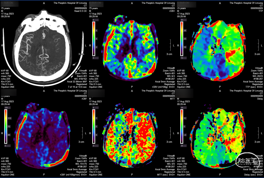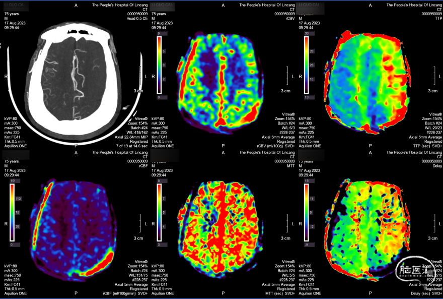 CTP:左侧大脑半球大面积TTP及MTT延长,CBV左侧大脑半球大面积TTP及MTT延长,rCBV基本正常或轻度下降,rCBF下降,符合脑梗死前期Ⅱ1期表现。