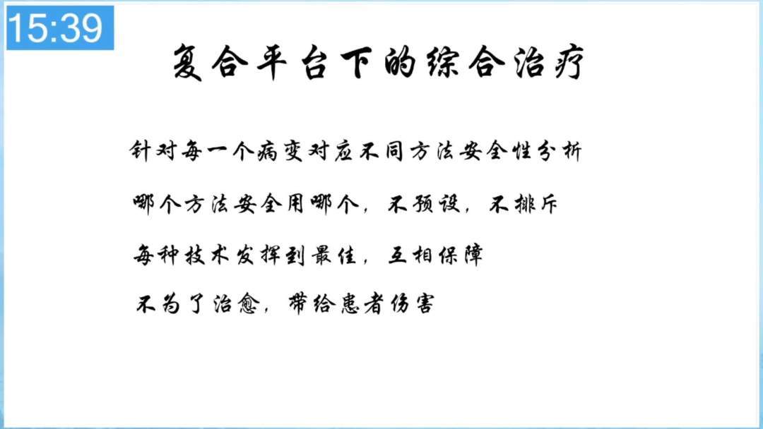 合理的复合平台下的综合治疗,针对每一个病变对应不同方法安全性分析,不预设、不排斥,每种技术发挥到最佳,互相保障。