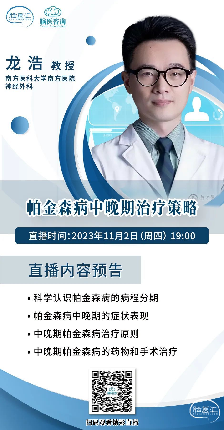 11月2日(周四) 19:00,南方医科大学南方医院神经外科 龙浩教授为大家带来“帕金森病中晚期治疗策略”,围绕帕金森病患者及其家属关心的热点问题进行解惑,还有线上互动环节,患者及家属有机会获得专家一对一答疑,欢迎大家进行线上留言提问!